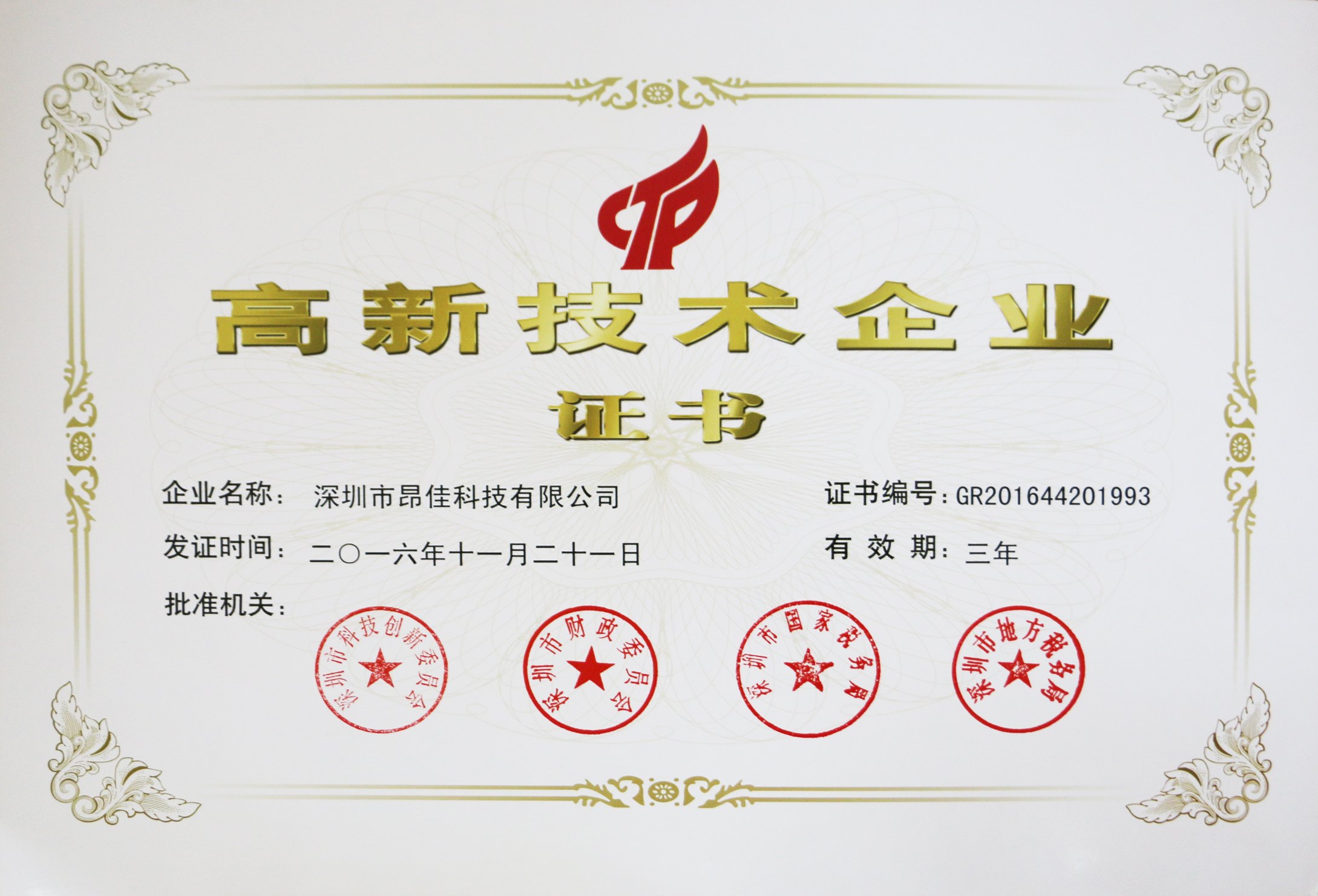2016年11月21日,深圳市昂佳科技有限公司(以下簡稱昂佳科技)榮獲了由深圳市科技創(chuàng)新委員會、深圳市財政委員會、深圳市國家稅務(wù)局、深圳市地方稅務(wù)局四部門聯(lián)合批準頒發(fā)的深圳市“高新技術(shù)企業(yè)”榮譽稱號,對于昂佳科技來說,不僅是其發(fā)展史上一件里程碑意義的盛事,同時也代表企業(yè)實力和科技創(chuàng)新能力受到政府部門認可。