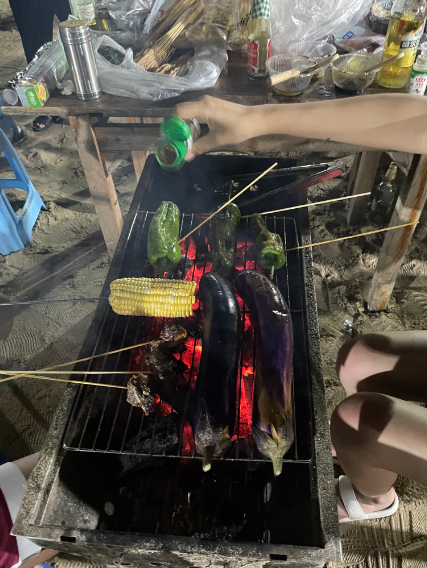 養足了精神,帶上準備好的食材大家來到了海邊,開始搬桌子、擺椅子、搭爐子, 開始海邊燒烤,男女搭配干活不累,大家分工合作,不一會兒,香噴噴的味道就迎著海風撲面而來,我們看海上升明月,對酒當歌!